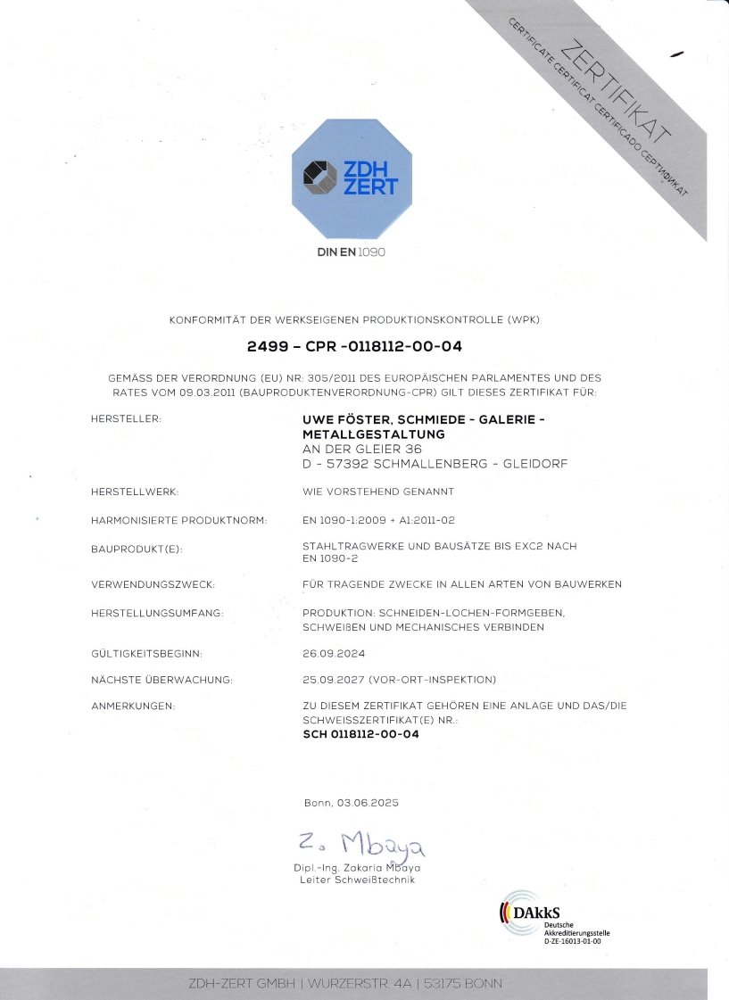 Zertifizierung nach DIN EN 1090 Die hohen Investitionen in Maschinen und Ausbildung der Mitarbeiter hat sich in der Zertifizierung nach DIN EN 1090 niedergeschlagen. Wir dürfen und können Projekte bearbeiten, die nicht jeder schafft und darf.